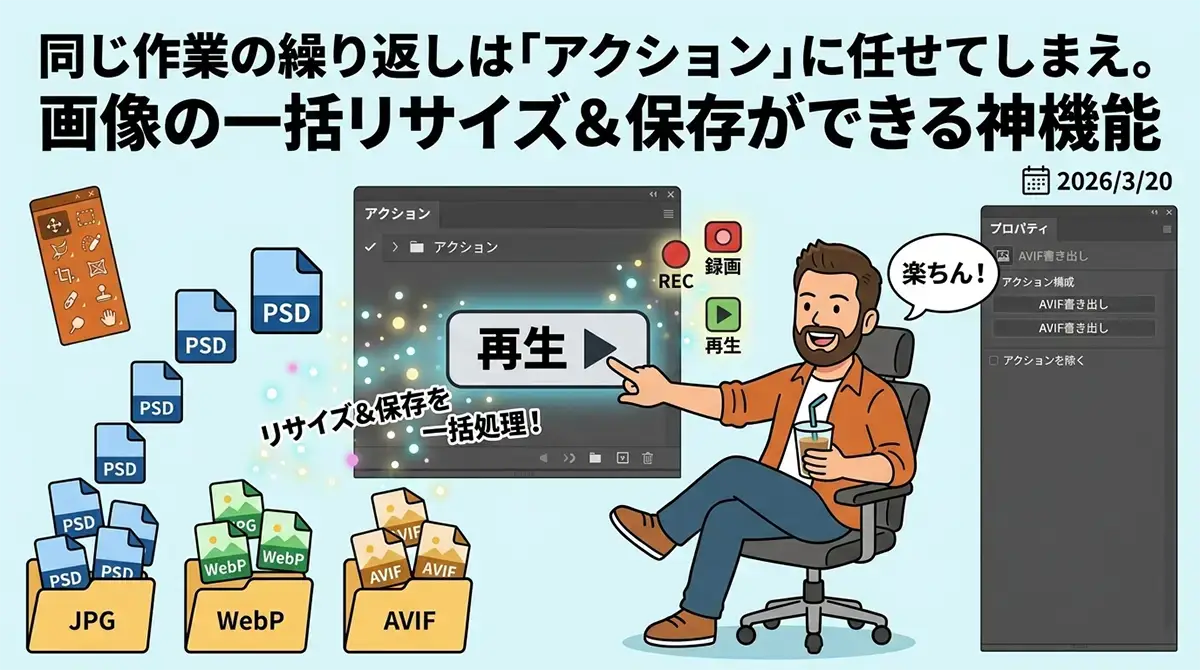 今回の検証で使っているのはPhotoshopです。AVIF書き出しは最新版で対応しているので、これから始めるならここは必須です。